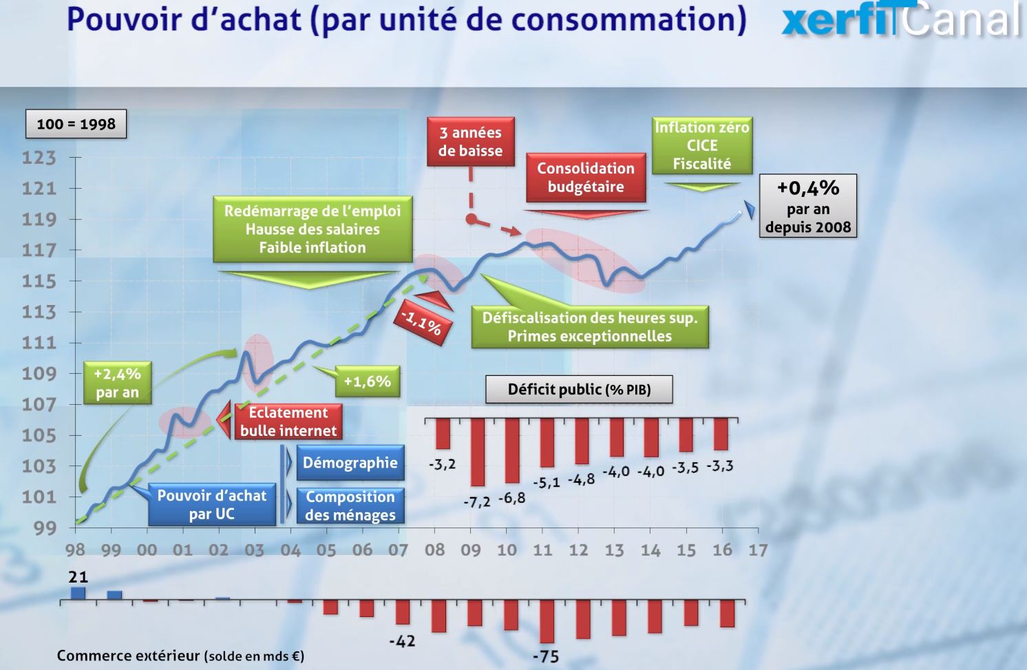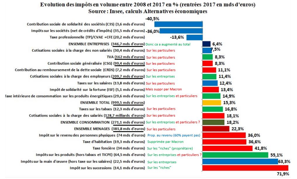 Intéressant ton graphique. T'as la source pour y lire leurs explications ? Là j'ai du mal à voir ce que regroupe les "ENSEMBLE" du coup Puis faut regarder chaque masse d'argent, pas juste les % : une augmentation énorme de 72% d'un impot qui rapporte "relativement" peu et qui est sur les "riches", bah c'est pas pareil J'ai pas mal de mal à lire ce graphique n'empêche. C'est vrai que ENSEMBLE MENAGE (donc TVA + impots revenu + CSG + CRDS + taxe tabac-TICPE ?) a beaucoup augmenté. Mais la masse d'argent est environ = à ENSEMBEL ENTREPRISES, et l'impot reste "équitable" (enfin ceci dit certains trouvent pas équitable que tout le monde paye la TVA)  Citation : Le peuple paye pour entretenir l'oligarchie, sans aucun résultat sur les chiffres d'emploi et de chômage. Oligarchie c'est différent d'entreprise non ? Et ces valeurs sont donc des moyennes. Quid alors de la moyenne du pouvoir d'achat que j'ai rapporté comme augmentant chaque année depuis 1960 ? Citation : Le pouvoir d'achat moyen n'a cessé d'augmenté Citation :