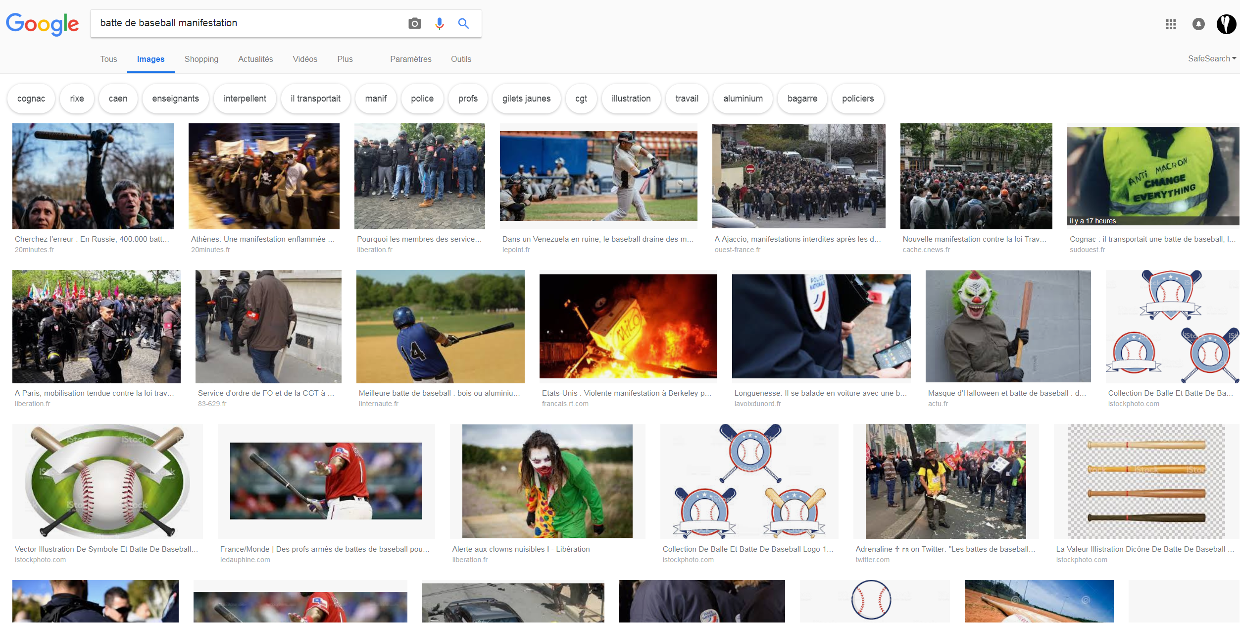 S'il te plait, montre les moi, je n'arrive pas à les trouver sur google:  Tu as volontairement ignoré la suite de ma phrase où je dit avoir une barre de fer dans mon coffre de voiture pour me défendre. Vous trouvez ça normal d'arrêter des familles car elles ont voulue manifesté en se protégeant des lacrymo que les flics lance sur tout le monde ? Bref, vous parlez sans n'avoir mis les pieds aux manifs gilet jaune, sans avoir parlé aux gens qui manifestent, sans avoir pris dans la gueule lacrymo et charge. Vous ne pouvez juger ce que vous ne connaissez pas, moi je peux, j'y étais et je parle donc de mon vécu et ressenti.