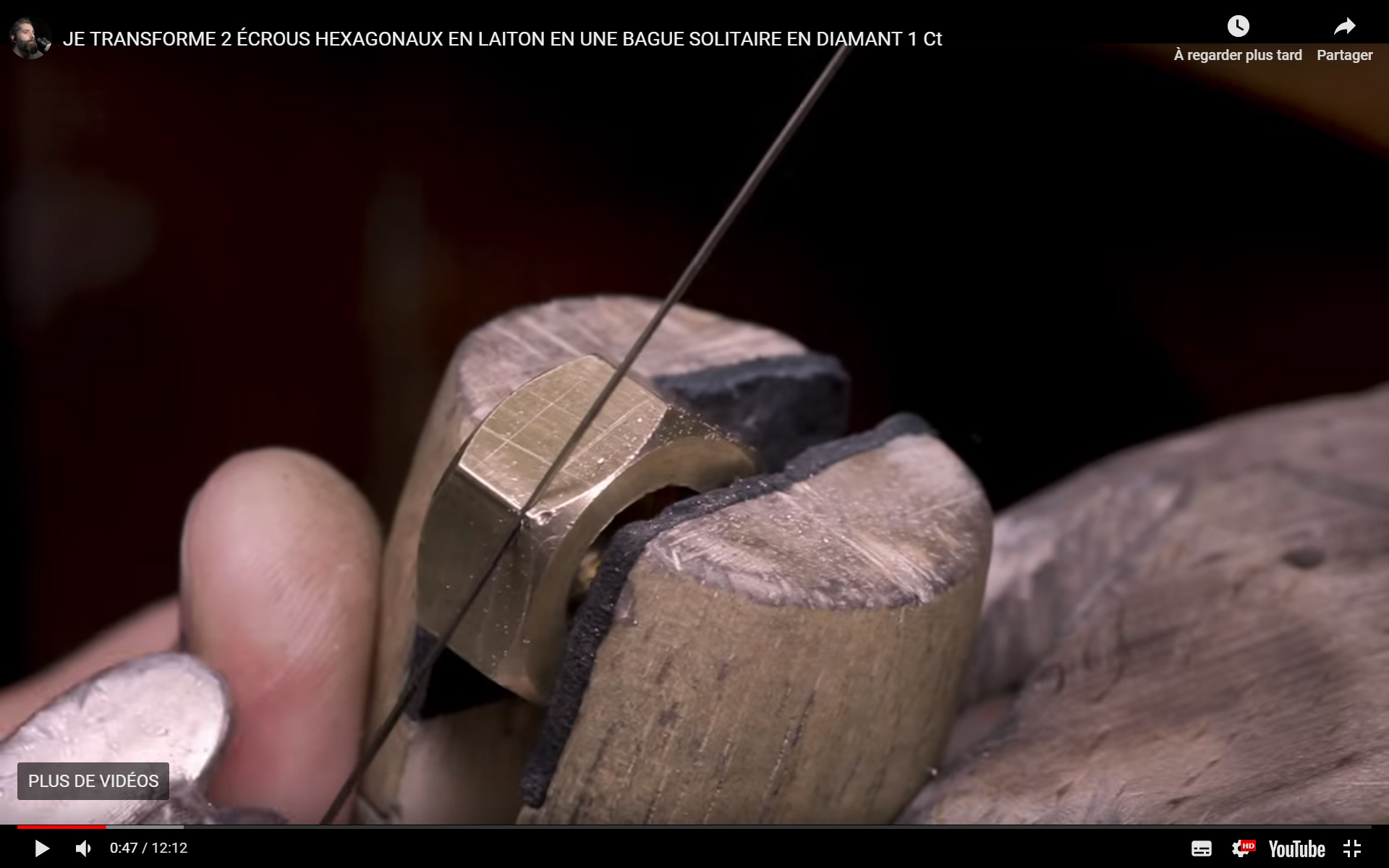 Pour avoir deux côtés bien plats! Car les bords d'un écrou n'est pas plat il y a un biseau...(tu le vois sur la tof de la vignette) Et même si il fini par en faire un a la fin, pour pouvoir tracer ses repaires il lui fait bien une surface plane! Bon par contre il nous fait un peu de folklore car s'amuser a tracer le contour et tronçonner en deux fois la pièce pour montrer du taf fait main, il en avait pour pas plus longtemps, même a la main de limer chaque côté avec une grosse lime pour enlever les même pas 2 mm de chaque côté.Mais je comprend que ça ne rendrait pas aussi bien. Ca me rappelle une bague toute simple que j'avais torché vite fait en une 1/2 heure en 4 coups de meule pour une ex dans un bout d'inox a la con avec un bout de nacre. ![]()