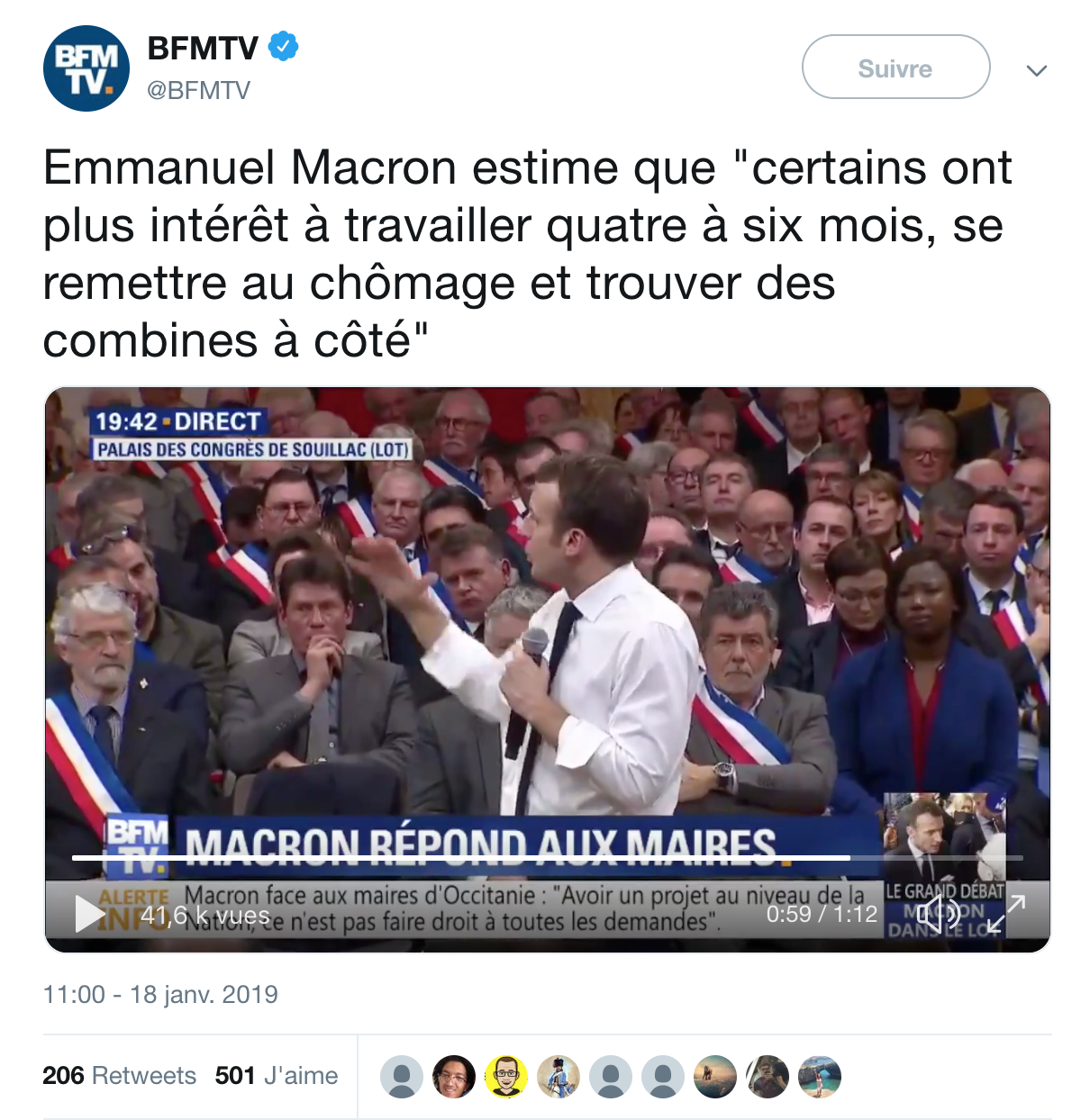 7 Millions de chômeurs. 98% des offres pourvues. 40 chômeurs pour un poste. Un allocataire sur deux qui demande ses droits. 15000 morts dû au chômage. La moitié des offres d'emploi proposées par Pôle Emploi sont illégales. La moitié des offres sont en CDD. En 30 ans, le nombre de CDD a plus que doublé, les contrats sont passés de 3 à 1 mois. Le nombre de SDF a augmenté de 50% en 10 ans. Mais attention, Macron a trouvé les fautifs. ![]() 4 Milliards d'ISF pour 7 Millions de chômeurs, c'est 570 euros/chômeur/an. 20 Milliards de CICE pour 7 Millions de chômeurs, c'est 2850/chômeur/an. 4 Milliards d'ISF pour 200 000 SDF, c'est 20 000 euros/SDF/an. 20 Milliards de CICE pour 200 000 SDF, c'est 100 000 euros/SDF/an. Et sinon, petite chronique de la déviance faaaaaasciste (et oui, je n'arrêterai pas) du pouvoir : ![]() flash-ball-il-faut-annoncer-clairement-aux-manifestants-qu-ils-s-exposent-aux-violences-legitimes-des-forces-de-lordre Décryptage: que s'est-il passé à Bordeaux 12/01/19 Encore un autre dans le coma : https://www.lci.fr/social/gilets-jaunes-un-homme-blesse-en-manifestation-plonge-dans-le-coma-2110467.html Il faut clairement que ce gouvernement soit renversé.