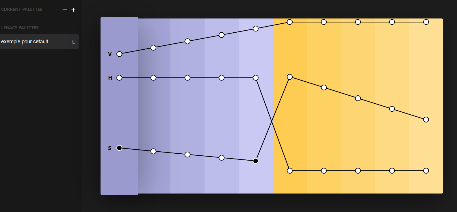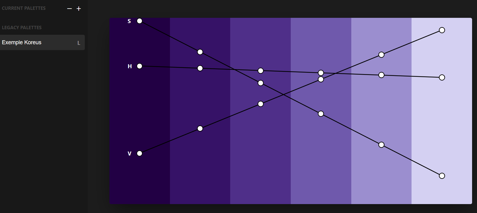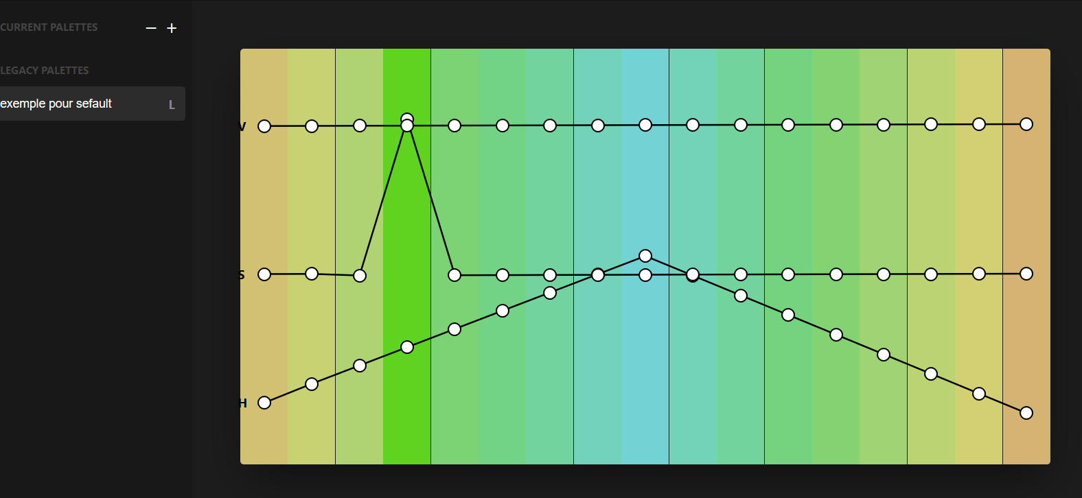 En haut à gauche S : saturation (...) H : hue (nuance) V : value (un genre d'intensité lumineuse on va dire, en gros c'est la qté de blanc/noir dans ta couleur) L'idée de cet outil est de faire varier ces 3 composantes essentielles de la couleur numérique de manière linéaire (si désiré) ou selon des courbes d'évolution (en t'amusant à faire des interpolations non linéaire). Exemple: Je souhaite un logo avec des couleurs pastelles et une couleur dominante. Que les couleurs aillent du jaune au bleu-vert mais que je dispose de 2 gammes de jaunes, une foncée me permettant de placer une base et une plus claire pour des finition. DONC Je règle la courbe H en pyramide. de cette manière j'obtiens 2 fois un dégradé jaune/bleu IDENTIQUE. Par dessus je dispose ma courbe de valeur qui va progresser selon un modèle y=x. Du coup les deux dégradés vont se différencier par leur intensité mais ils restent en accord. Et enfin avec une saturation assez basse j'obtiens mes tons "pastels". Mais je veux qu'une partie de mes couleurs ressortent (des dominantes). Du coup je règle la courbe S toute droite assez basse, avec un pic à l'endroit où je souhaite que mes couleurs soient dominantes. et on obtient ça: ![]() d'autres logiciels du genre se contentent de simplement te construire ta palette en fonction de courbes préconçues (des modèles sur-utilisés mais pas forcément adapté à ce que tu fais) J'espère que mon explication t'a éclairé ! EDIT: pour que ça te parle peut être un peu mieux: ![]()