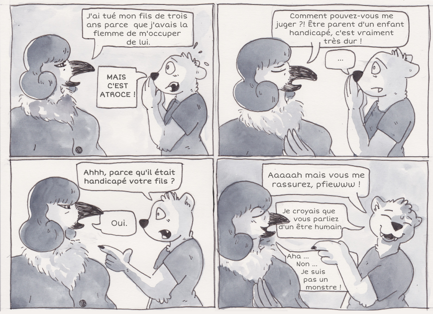 Autant j'aurais fait comme elle à sa place, autant je ne peux pas m'empêcher de justement me mettre à la place du gosse qui n'aurait peut-être pas voulu mourir. On se rend pas compte, mais peut-être que finalement les gens qui vivent ce que nous, valident, considérons comme un enfer, sont heureux d'être entourés. Parce qu'en définitive, ces personnes ne vivent jamais seules. Invalides, certes, mais vraiment entourées.