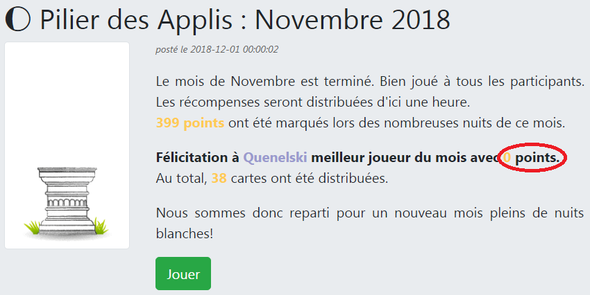 Pour info (ce n'est pas une réclamation mais aboule les cartes et pas des doubles ! )![]() La quenelle ultime aurait été de recevoir 1 seule carte générée sur les 2 récompenses pour avoir gagné le pilier ! ^^