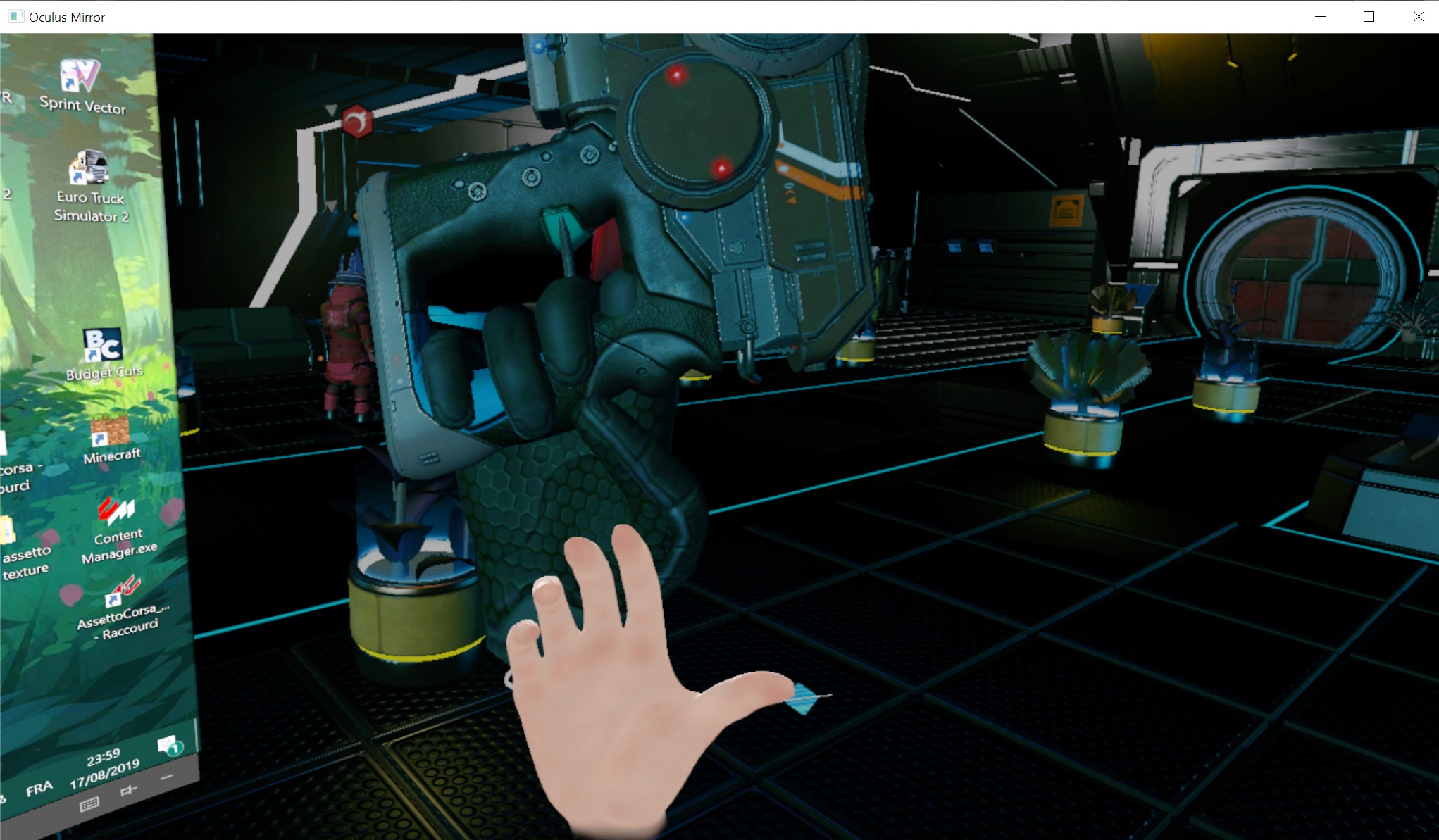 Mais j'ai un gros problème depuis ce soir.. La position ig de la main ne correspond plus à celle du contrôleur oculus et de plus le multi outils est décalé par rapport à la main (même genre de problème dans le vaisseau, les mains ne sont plus du tout là où il y a les manettes. démonstration: ![]() J'ai activé le menu oculus donc vous pouvez voir la main virtuelle de l'app qui correspond au vrais emplacement de ma main (si je fais la même chose avec steam vr je vois mes contrôleurs au même endroit) J'ai rallumé mon pc et réinstallé ma position dans oculus, j'ai relancé plusieurs fois le jeu. Au final en relançant une nouvelle partie je n'ai plus le problème donc j'ai l’horrible impression que ma sauvegarde est corrompu