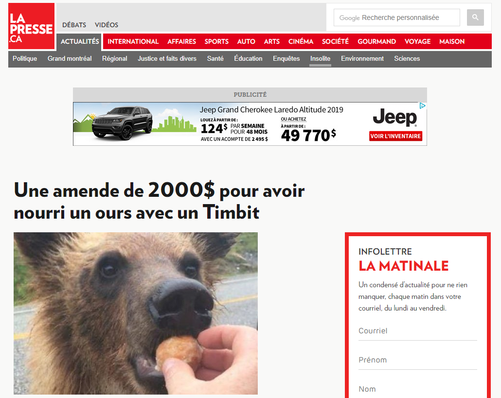un Timbit est le milieu de donut pas cher que plein de monde mange au Canada (souvent dans les bureaux) et qui proviennent des café Tim Horton's café typique et symbolique canadiens (3200 contre 1400 Starbucks) ![]() Extrait: "Le service des agents de conservation de la province a indiqué que le 22 août un juge de la Cour provinciale a ordonné à l’homme de se tenir à une distance d’au moins 50 mètres des ours pendant un mois."