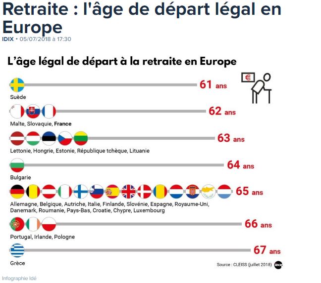 Même la Grèce nous dépasse... Et ce serait intéressant d'avoir les durées de cotisation par pays européen, pour moi c'est bien plus parlant que l'âge légal. En clair combien de temps on est obligé de taffer avant de pouvoir toucher sa retraite complète? Et s'ils repoussent l'âge de départ légal, l'ouvrier qui a commencé sa carrière à 18 piges (voir 16 ans en étant apprenti) sans interruption, il se fait baiser dans l'histoire? Sinon les 62 ans, ça date de 2010 je crois. Donc le coup de l'espérance de vie qui augmente depuis 2010 très peu pour moi... Quand au politiques, tant qu'on aura pas aligner leur salaire sur le salaire médian des Français, ils resteront perchés sur leur tour d'ivoire à ne rien comprendre au quotidien de leurs concitoyens. Dans les élus, heureusement que les Maires (surtout ruraux) sauvent la mise! Pourtant c'est les moins reconnus, c'est ceux qui travaillent le plus et c'est les plus mal payés... Cherchez l'erreur... Et sinon: https://www.lemonde.fr/societe/article/2019/09/13/la-mise-en-examen-de-richard-ferrand-complique-la-rentree-de-l-executif_5509756_3224.html Où est-elle la république exemplaire qu'ils avaient promis? Un sacré paquet de homards, un jour ils vont passer à la casserole. Les paysans qui ruinaient les permanences avaient 1000 fois raison! Du fumier pour les fumiers!