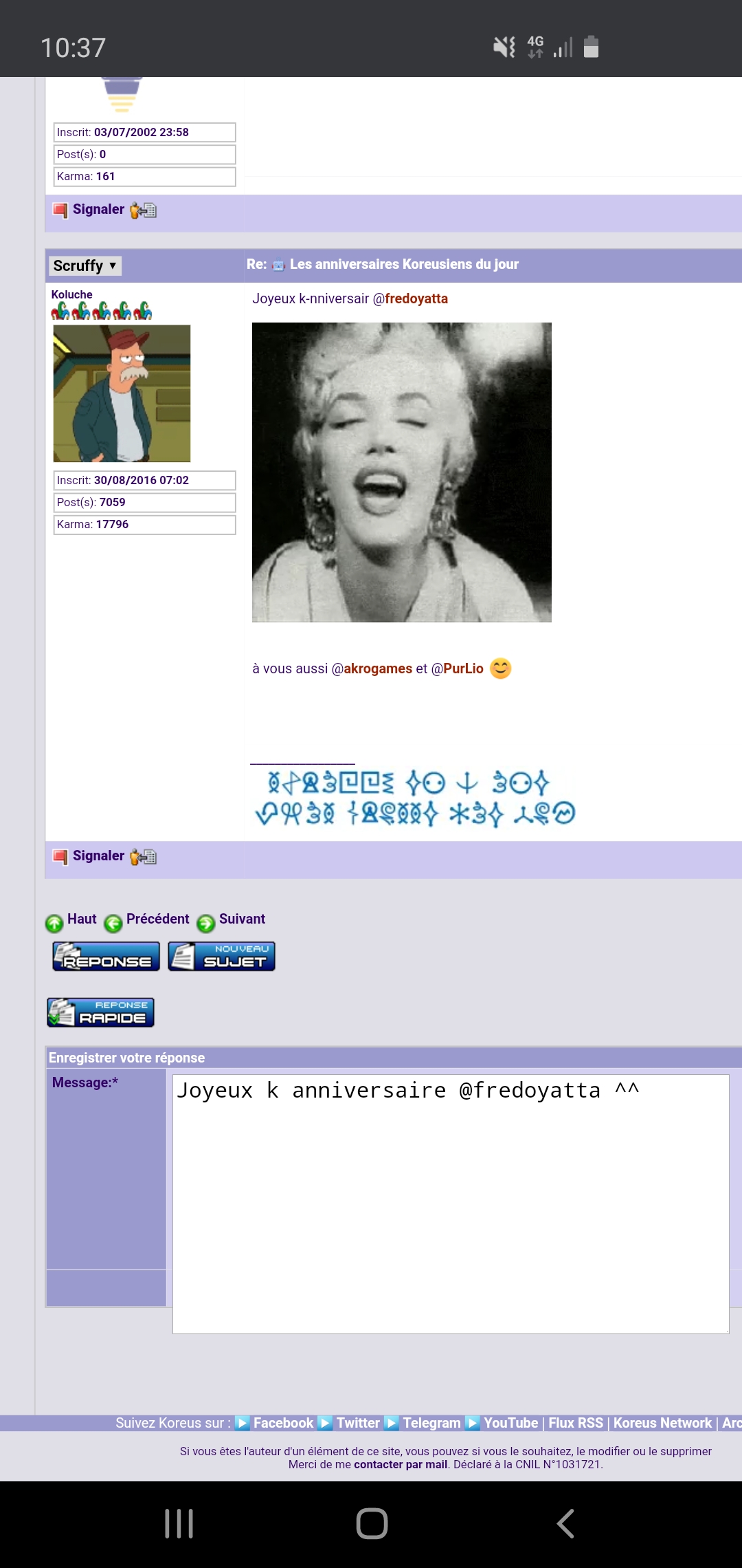 ![]() Bonjour @Koreus , quand j'écrit un message sur mon portable en utilisant la case de réponse rapide, la case en question augmente en hauteur et cache le bouton valider. C'est normal ? ^^