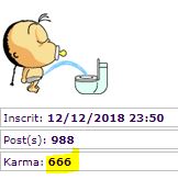 | Je suis accro    Inscrit: 20/09/2008 15:17 Post(s): 1560 Karma: 81 | Il passera pas discrètement celui là ! Joli score ! Que le post soit abondant, et que le karma soit avec toi !