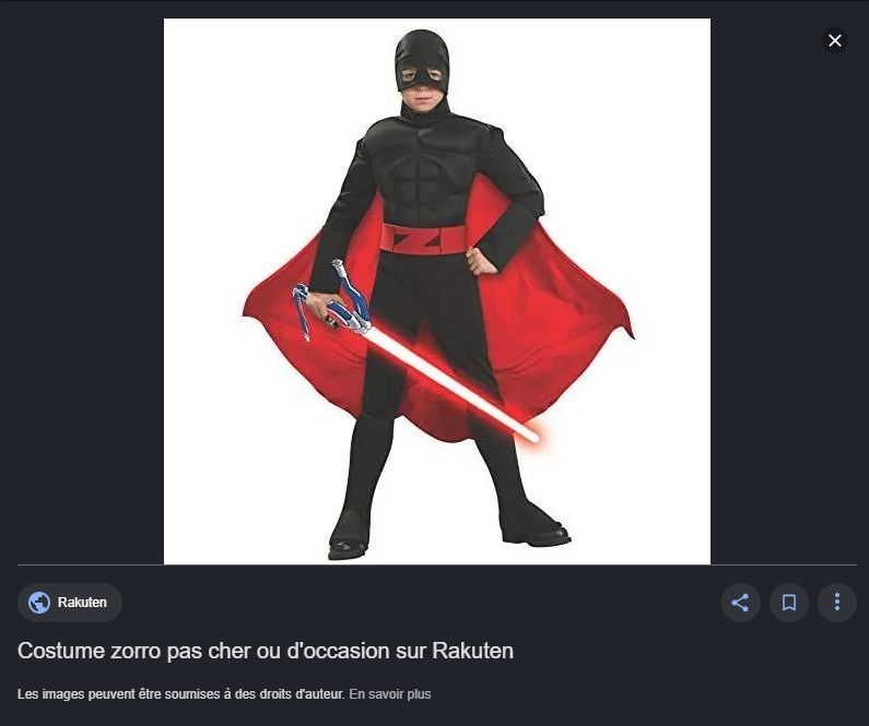 | Fantôme | @-Flo-  Je viens de jeter un oeil aux photos, je crois que j'ai trouvé les zorros les plus cheap de l'histoire.^^ https://images.halloweencostumes.com/products/9099/1-1/adult-zorro-costume.jpg https://cdn.vegaoo.co.uk/images/rep_art/gra/310/7/310743/zorro-costume-for-adults.jpg https://p2.liveauctioneers.com/663/15124/4903565_1_l.jpg https://costumesupercenter-weblinc.netdna-ssl.com/product_images/mens-deluxe-zorro-costume/573d463f69702d70de001187/large_thumb.jpg?c=1464110382