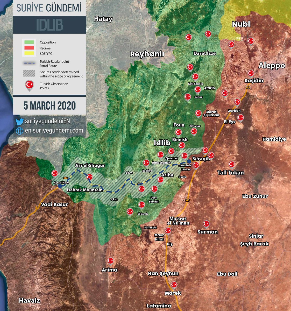 https://www.areion24.news/2020/03/06/la-renaissance-de-l%E2%80%89armee-des-sables%E2%80%89-succes-et-defis-des-forces-armees-mauritaniennes/ Ça revient un peu a ce que je disais, l'armée française dans le coin fait du bon job, mais si derrière les politiques africains ne font rien, ça ne sert a rien. La on peut voir un pays qui s'est donné le moyen de ses ambitions et ça paie ! La France mise beaucoup sur ce pays, car bientôt il devrait prendre la direction du G5 Sahel, il pourrait devenir un très bon exemple pour ces pays et les faire se bouger le fion efficacement. Un nouveau souffle d'air pour la région ? C'est bien d'avoir des victoires militaires tactiques sur le terrain, mais c'est efficace seulement si on les transformes en avantage stratégique, ce qui n'est jamais le cas. C'est là où l'expérience mauritanienne pourrait être efficace. Reste un problème de taille pour ces pays, ils ont toujours maintenu une armée nationale faible et peu entraînée, de peur que celle ci ne devienne populaire et renverse l'état. Donc quand le terrorisme a explosé dans la région, ces armées n'ont pas su combattre efficacement. Maintenant a voir si ces pays prendront le risque de renforcer efficacement leur armée. En tout cas la zone a une opportunité de s'en sortir, ou tout du moins de stabiliser la situation, on verra si les états africains sauront saisir l'opportunité. Pour la Syrie j'ai pu recoupé plus d'info sur l'actuel accord Russo turc. ![]() Jolie carte lisible ![]() Alors les territoires récupérer par l'armée syrienne ces dernières semaines resteront syriens, Erdogan a demandé a retrouver les limites définies lors de l'accord de Sotchi et d'astana, mais poutine a dit "nope". Donc les récents succès de l'armée syrienne resteront syriens ! Concernant la M4, ce sera une zone tampon, surveillé par des patrouilles turco-russe. La zone s'étendra de 6 km au nord de la route, et de 6 km au sud, soit une bande large de 12km. De nouvelles infos devraient arrivées. Car il y'a au moins 2 inconnus. 1. La zone rebelle située au sud de cette zone tampon se retrouve totalement isolée du coup, que deviendra t'elle ? Possible que les rebelles soient expédiés au nord et que le régime la récupère. 2. Al shugur est dans la zone tampon, or c'est une ville contrôlé par un groupe djihadiste, que deviendront ils ? Réexpédié au nord ? Ils vivront en autarcie !? Normalement des précisions devrait arriver dans les jours qui viennent.