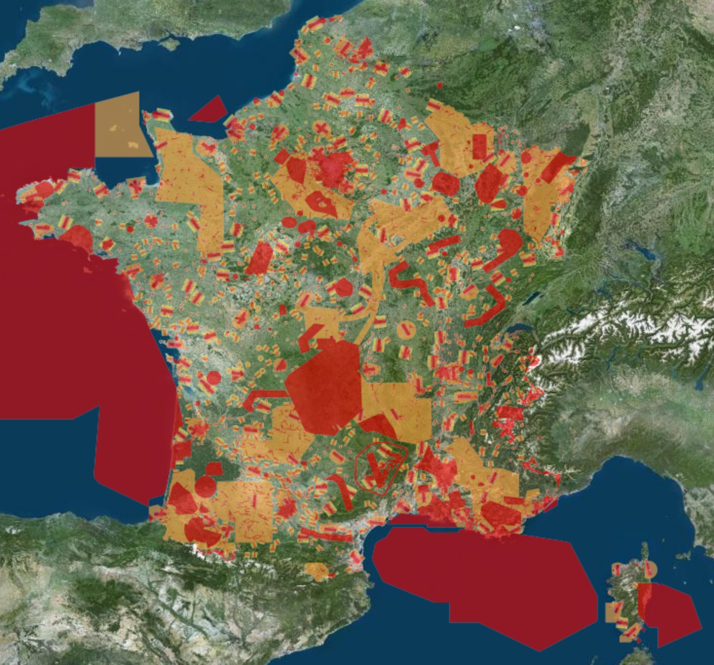 Geoportail -> Territoires et Transports -> Foncier Cadastre et Urbanisme -> Restrictions pour Drones