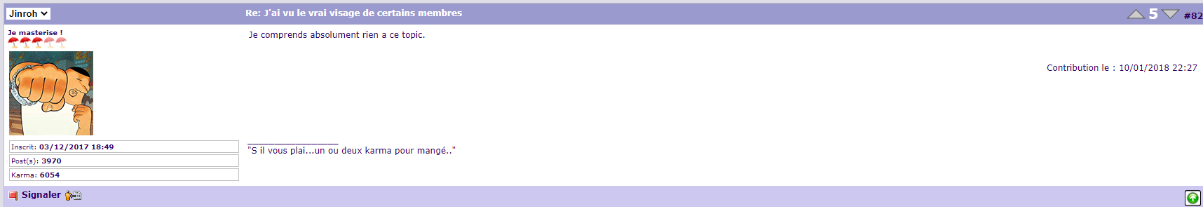 Pétard je te déteste, je devais me pieuter avant minuit, à cause de toi j'ai lu plusieurs pages de ce sujet et v'là qu'il est vingt passé de minuit. T'es vraiment une rascale de pied-tendre, tu mérites le goudron et les plumes. En tout cas, je trouve ça ouf, je me suis inscrit seulement un mois après ce bordel et même si j'ai déjà entendu parler une ou deux fois des membres évoqués dans ce sujet, j'ai pas eu l'impression d'arriver juste après une affaire aussi houleuse.^^ Et sinon, je ne m'attendais pas à me marrer en lisant ce sujet, mais grâce à un membre honorable, je me suis bidonné comme un con. ![]() T'es une perle Jinroh, ne change rien. ![]()