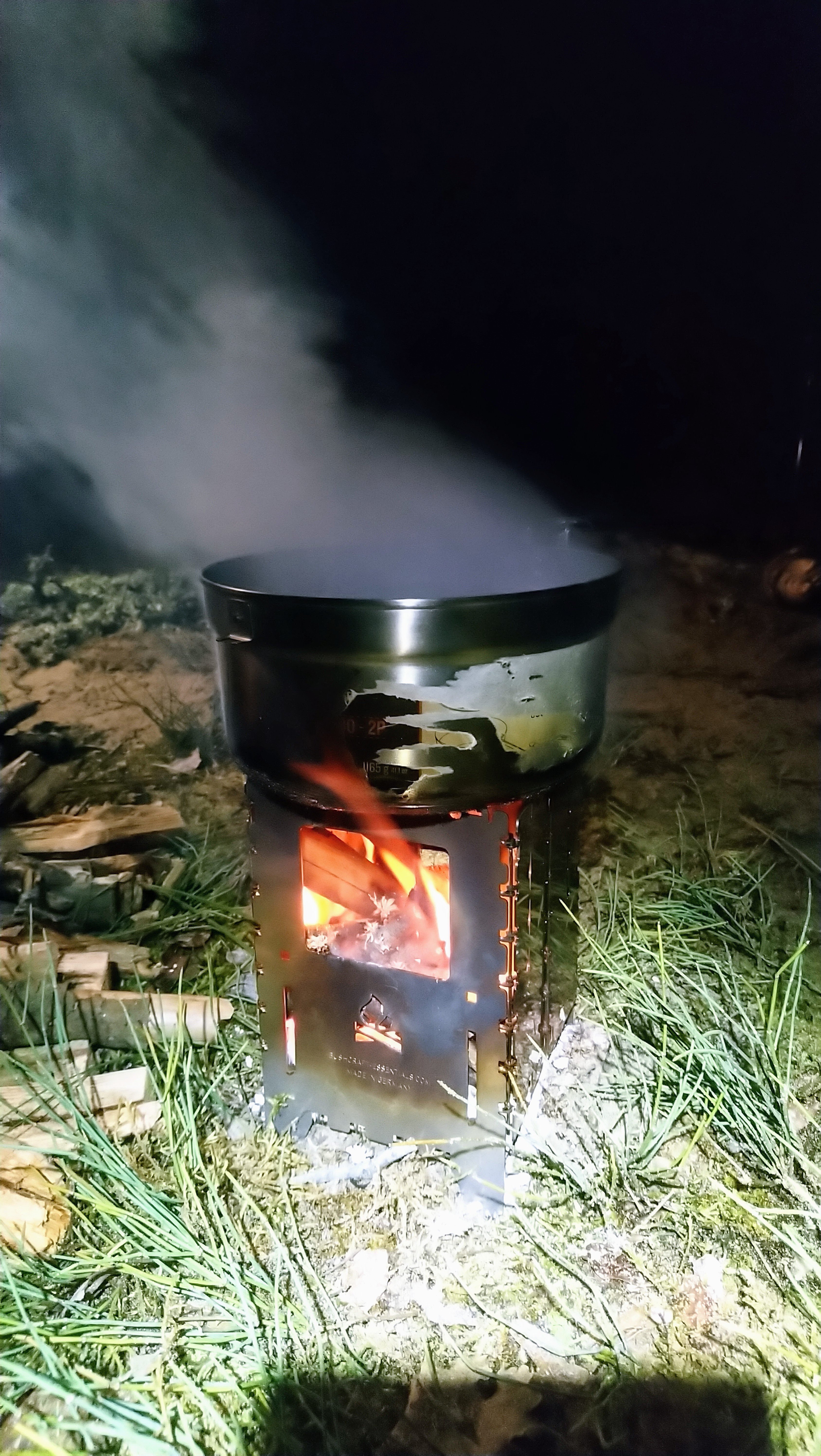 Le premier soir mon frangin prépare le repas (surprise) sinon les autres repas ce sera du lyophilisé ! Je ramène mon réchaud à bois pour nous chauffer et cuisiner : ![]()