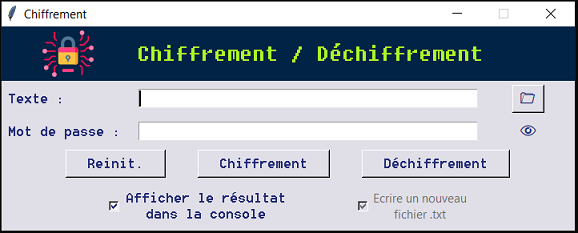 A priori ton programme cible des personnes qui cherchent un peu plus de sécurité informatique, mais tu le délivres en EXE sur un forum, ce qui est une des premières chose à ne surtout pas faire en terme de sécurité pour un utilisateur. Je rappelles que c'est la mode des ransonware ou des mineurs de crypto..... Ok, tu te sert du mot de passe comme clé. Je ne peut pas l'affirmer (si qnn peut confirmer) mais ça doit être facile à casser. En général on utilise des clé RSA, AES, .... J'ai bien compris que tu aimais bien programmer, mais j'ai toujours du mal à "réinventer la roue". Tu as regardé Keepass ? Le code source est disponible si cela t’intéresse.