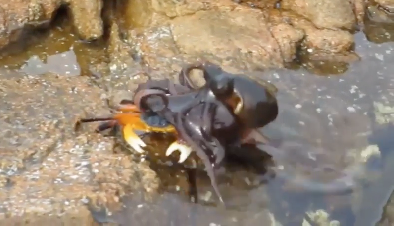 C'est un gif, déso -> Octopus attacks a crab and drags it into the abyss