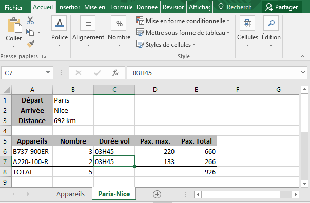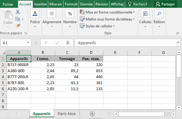 Je ne sais pas trop comment s'appelle ce que je souhaite faire donc, sorry pour le titre "mystérieux". Sur une des pages de mon tableur, baptisée "Appareils", j'ai regroupé une liste d'avions avec plusieurs caractéristiques : ![]() Sur les autres pages, j'indique une ligne aérienne (Paris-Nice dans mon exemple ci-dessous). Chaque autre page correspond à une ligne aérienne. Sur les pages des lignes aériennes, je voudrais quand je note le nom d'un appareil que les informations reprise sur la page "Appareils" se mettent automatiquement : ![]() Voilà, je ne sais pas si j'ai été clair mais je pense qu'il doit y avoir moyen de faire ça assez simplement avec Excel. J'avais une technique avec des "SI" par élimination mais je trouve que ça fait une formule super longue puisqu'au plus j'ai d'appareils dans ma page "Appareils", au plus je dois éliminer avec des "SI" et ça devient assez ingérable. J'imaginais plutôt un truc avec le tableur qui va rechercher les informations en fonction du nom de l'appareil que j'ai indiqué sur ma page de ligne aérienne. Merci d'avance