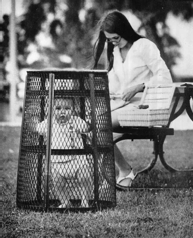 Une maman utilise une poubelle pour contenir son bébé pendant qu'elle fait du crochet dans un parc, 1969.