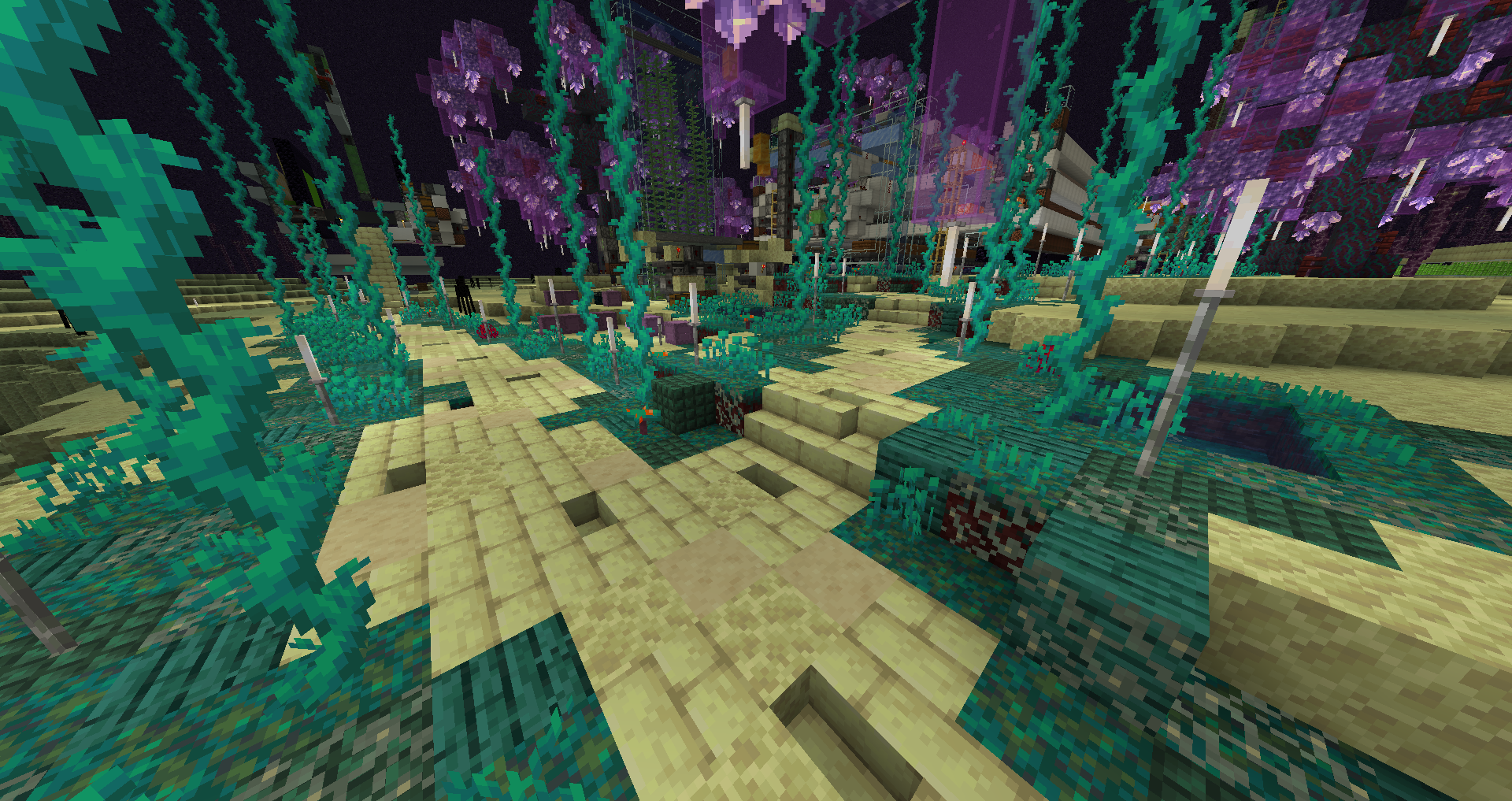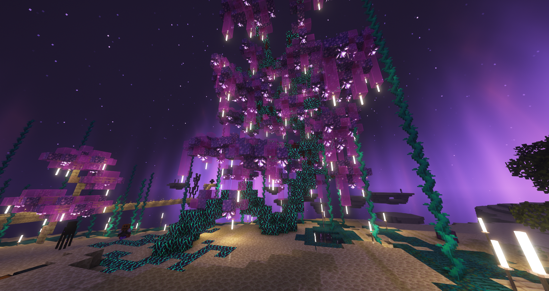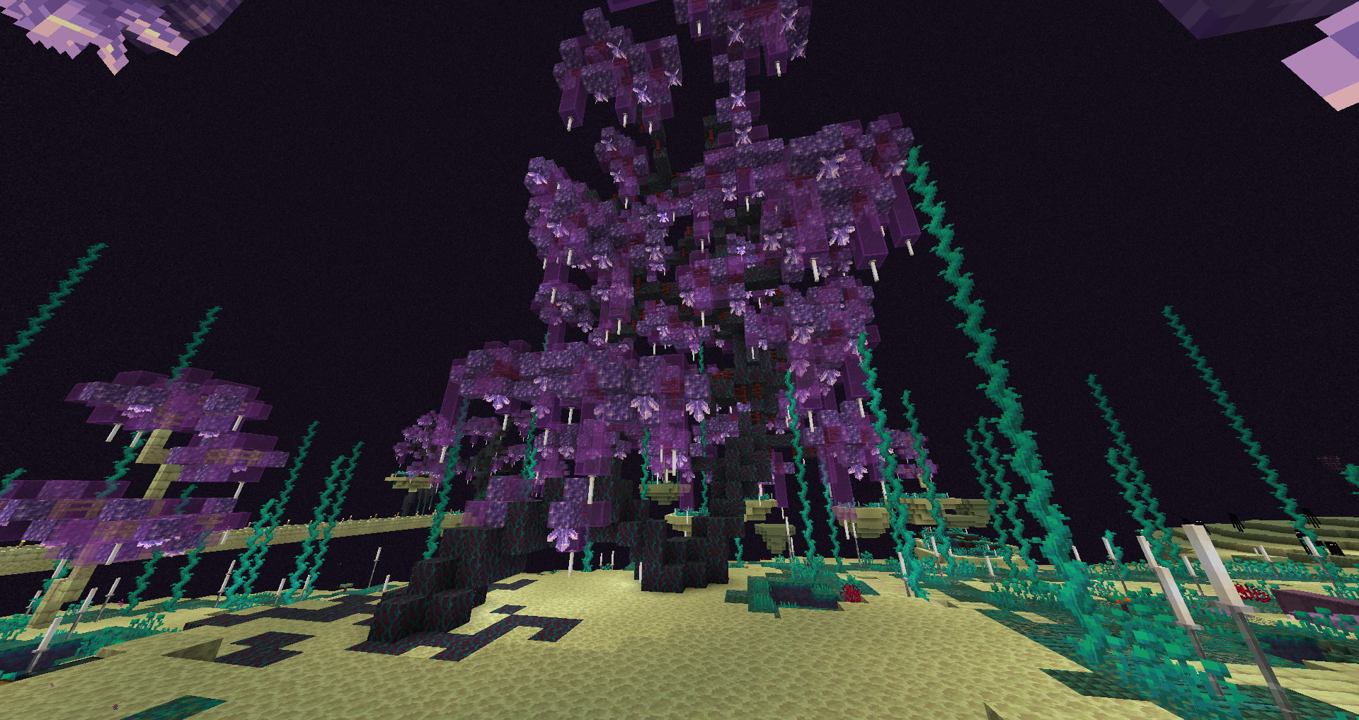 C'est pas l'île principale (puisque si on respawn le dragon il va tout péter) mais la première île quand on passe les portails, je regroupe des fermes dans ce coin. Pour le moment y'a la ferme à bone meal, kelp, canne à sucre et Warped trees, mais y'a celle pour les bouteilles de miel/ honey comb et Crimson trees de prévu pour le moment. Vue aérienne de l'île ![]() Les mini-îles autour (WIP) ![]() Gro n'arbre ![]() Et les chemins sur l'île ![]() Version shaders ![]()
