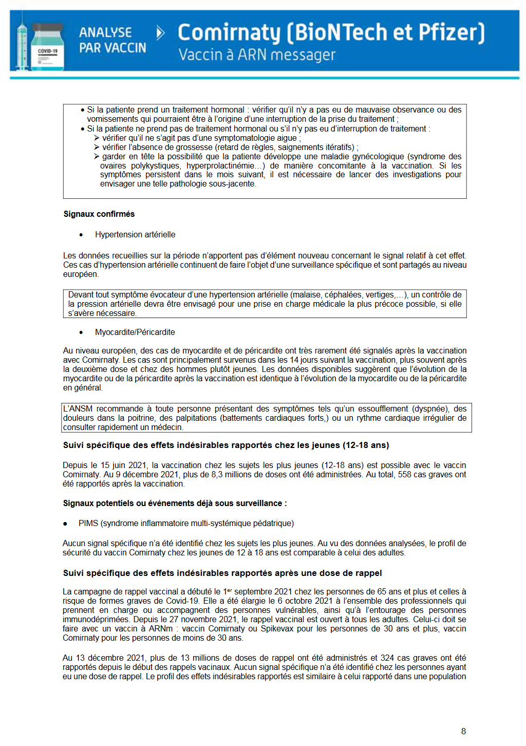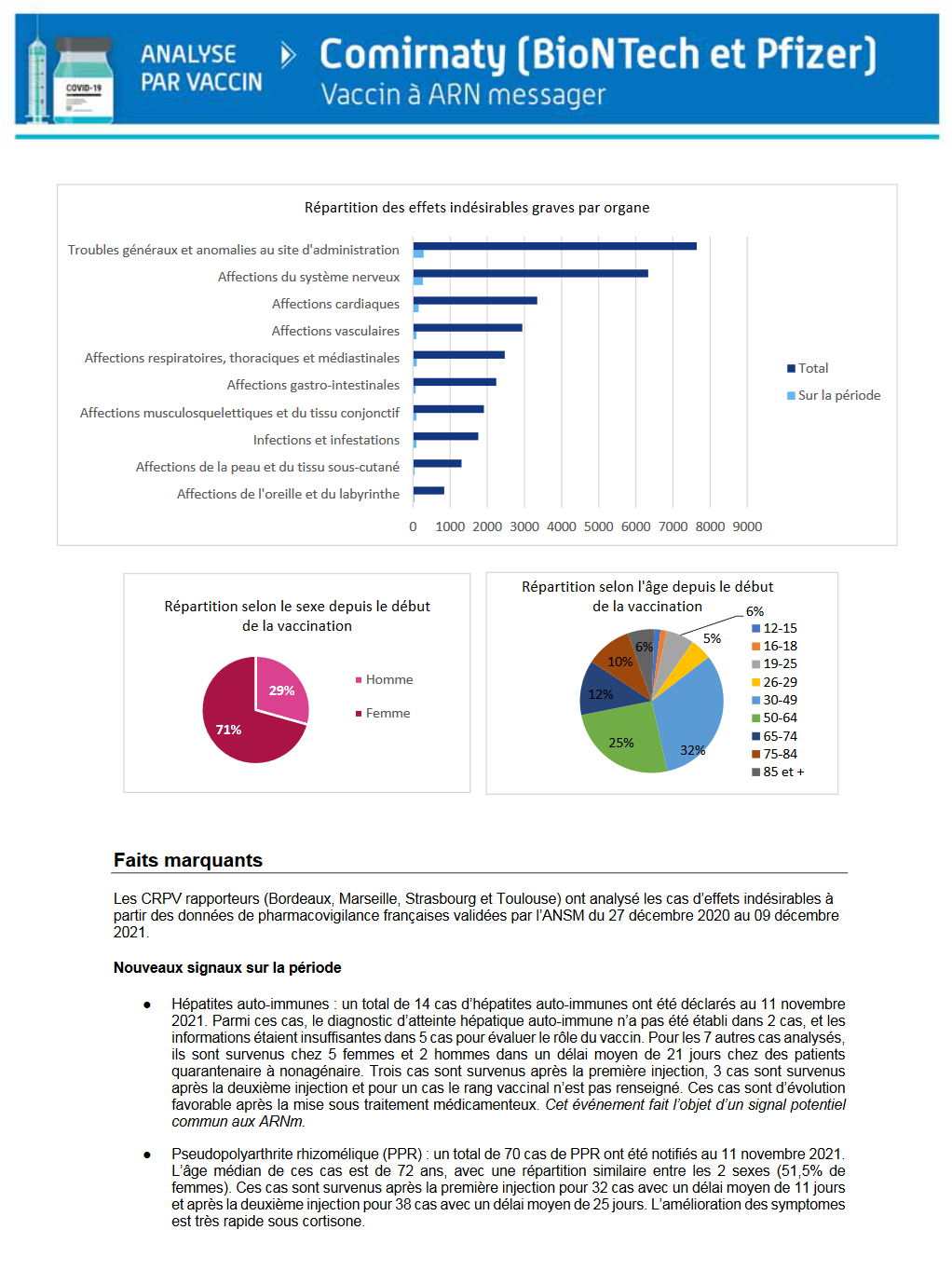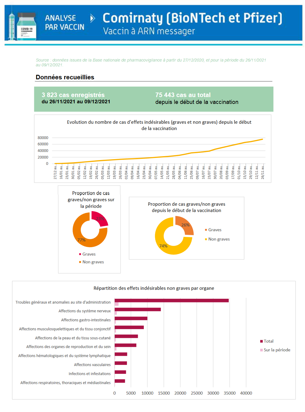 D'après les données de l'ANSM (Données françaises) : Total de vaccination : Plus de 111 222 700 injections ont été réalisées au total au 09/12/2021 Dont : o Plus de 90 036 800 injections avec COMIRNATY (BioNTech-Pfizer) o Plus de 12 314 500 injections avec SPIKEVAX (Moderna) o Plus de 7 811 700 injections avec VAXZEVRIA (AstraZeneca) o Plus de 1 059 600 injections avec COVID-19 VACCINE Janssen Nombre de cas d'effets indésirables (graves et non graves) depuis le début de la vaccination (au 09/12/2021) : 121 486 cas au total dont 24% de formes graves. Soit environ 29 156 formes graves en FRANCE à la date du 09/12/2021! Par exemple pour Pfizer : ![]() ![]() ![]() ![]() ![]() Pour les autres vaccins consulter ci dessous le premier dossier thématique : SOURCES : https://ansm.sante.fr/dossiers-thematiques/covid-19-suivi-hebdomadaire-des-cas-deffets-indesirables-des-vaccins Je ne vois pas de mortalité directement incriminé pour Pfizer par exemple mais il y a concomitance avec mortalité liés à des pathologies déclarées après vaccination, des effets indésirables très sérieux qui peuvent à court comme à moyens terme engager l'espérance de vie mais cela reste encore à l'étude et il y a encore de nouveau effets indésirables découverts même récemment, il y a un risque très faible mais existant de déclarer une maladie auto-immune ou une thrombose. Il faut regarder sur la masse de vaccination et se dire c'est la loterie des formes graves du covid contre la loterie des effets indésirables du vaccin. Balance bénéfice risque avec les premiers variants qui restait bonne maintenant avec Omicron ça rebat peut-être la carte de la campagne vaccinale et du passe vaccinale, ne faut-il pas mieux vacciner les personnes à risques en priorité et données des vaccins aux pays qui en manque, là est la question.