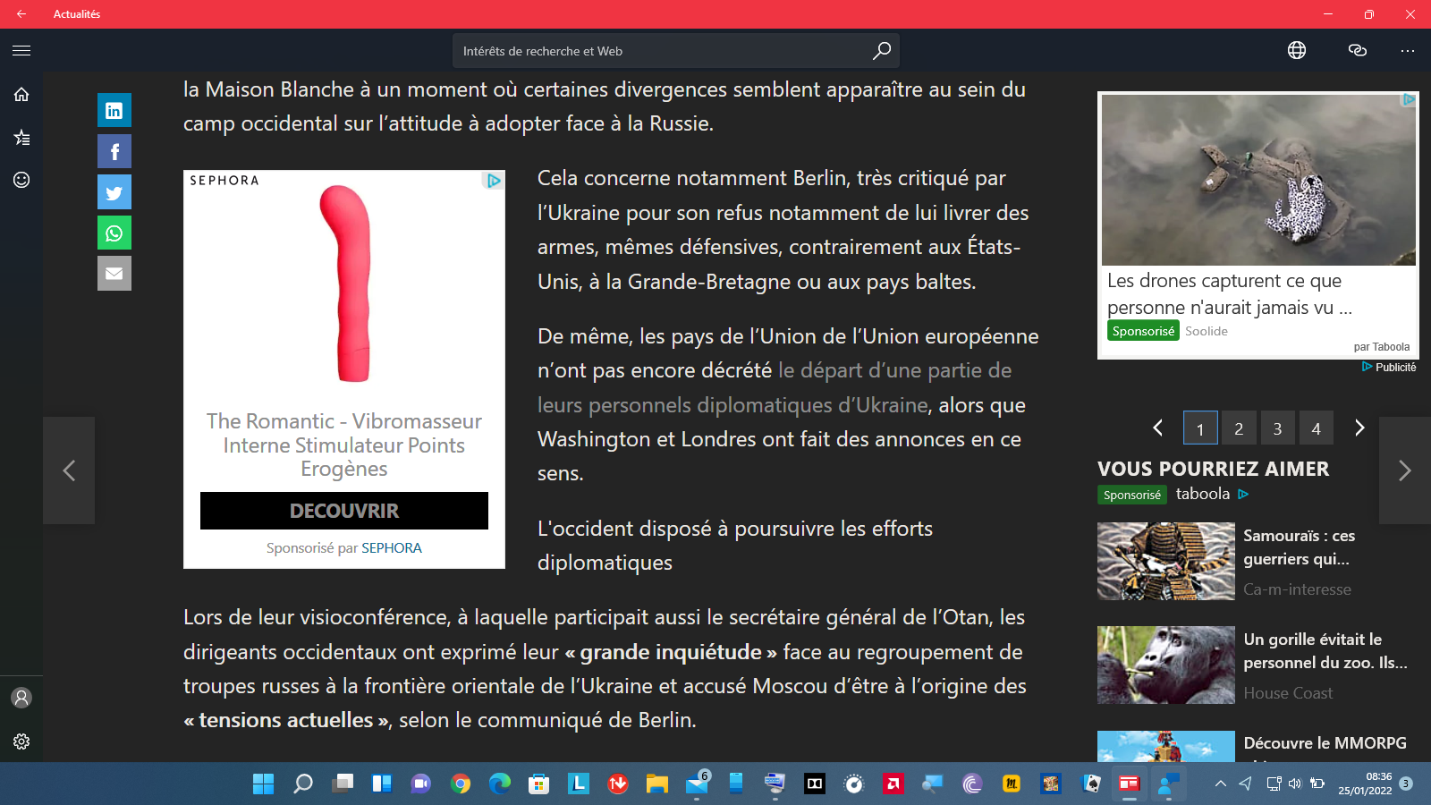 | Je masterise !    Inscrit: 09/01/2019 12:36 Post(s): 2434 Karma: 4970 | Les tensions en Ukraine sont préoccupentes. Mais Microsoft News a trouvé la solution en incluant une pub dans un article. La preuve avec une capture d'écran avec une publicité, prise ce matin sur mon ordi. Pas sûr qu'avec ce produit, les tensions dans cette région s'appaiseront. Et ce n'est pas un montage.