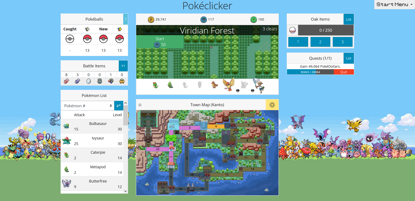 >>> Jouer à Pokéclicker <<< Synopsis: Pokeclicker est comme son nom l'indique un jeu Pokémon où il est nécessaire de cliquer afin de progresser au sein du jeu et dans lequel vous allez pouvoir capturer de nombreuses créatures issues de cet univers, mais aussi faire des missions pour obtenir des récompenses. Un clicker game dans l'univers de Pokémon. Que demande le peuple!? La progression est sympa! Désolé si vous souhaitiez être productif dans les prochaines semaines ... Comment Jouer: • souris Genre: #clicker#pokemon Bon jeu! ![]()