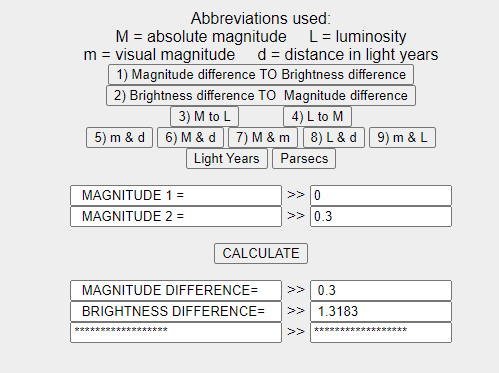 Pour calculer la brillance d'une étoile, on parle de sa magnitude (magnitude relative pour être précis, mais c'est un autre sujet). C'est une échelle logarithmique qui fait qu'à chaque point de magnitude en plus ou en moins, on considère que l'étoile brille 2,5x en plus ou en moins (précisément, racine 5ième de 100, soit 2,51). Exemple : une étoile de magnitude 1 est 2,5x plus brillante qu'une étoile de magnitude 2 (oui, plus la magnitude augmente, moins l'étoile est brillante), 6,25x plus brillante qu'une étoile de magnitude 3, etc. Quand ce sont des chiffres ronds, c'est facile, il suffit d'élever au carré 2,5 par la différence de magnitude. Exemple : entre une étoile de magnitude 2 et magnitude 6, il y a un écart de 4. L'étoile de magnitude 2 est donc 2,5^4 = +/- 39x plus brillante que celle de magnitude 6. Comment fait-on avec des virgules ? Différence de brillance entre une étoile de magnitude 0 et 0,3 par exemple ? Le même ? 2,5^0,3 ? Soit 1,3x plus brillante ? Et dans l'autre sens, quel est la différence de magnitude si une étoile est 10x plus brillante qu'une autre ? J'espère que c'est compréhensible. Sinon, j'invoquerai @ClaudeDB ![]()