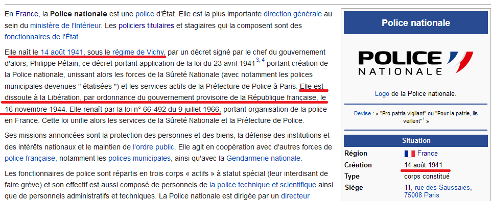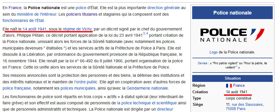 ![]() Mon propos portent seulement et uniquement sur le sujet de la police. Je n'ai pas abordé le sujet du régime de Vichy, ma connaissance dans ce domaine étant limitée au niveau scolaire, et ne souhaite pas le faire (pour la raison susnommée)