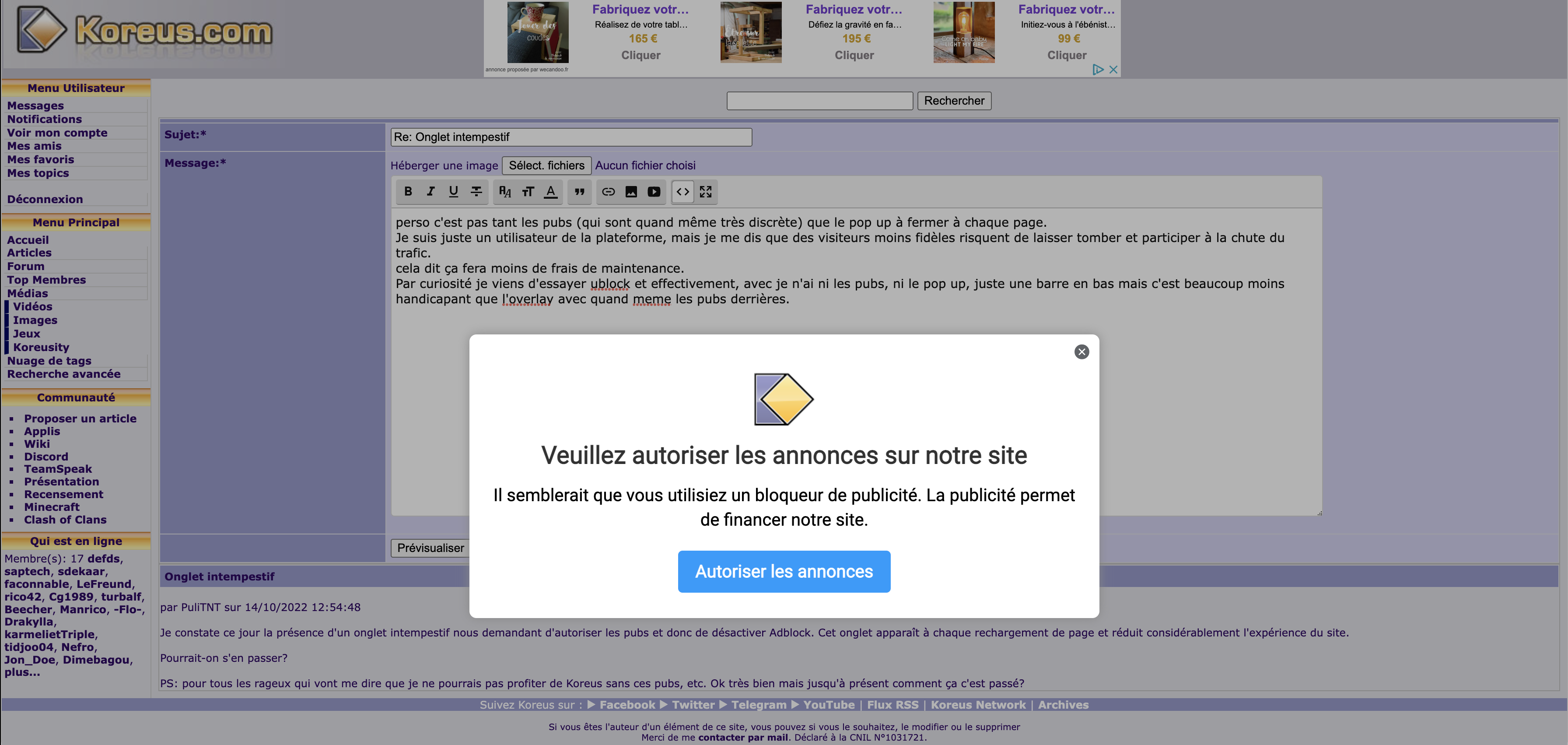 Si tu ne veux pas de pub et qui utilise donc ad block, je pense qu'un script détecte la présence de ad block dans les extensions du navigateur, peu importe que tu l'ai désactivé pour koreus.com.. ça ressemble au même script que varmatin.com ou je ne sais plus quel site d'information je viens de faire un test avec activation ublock origin (un bloqueur que je trouve bien mieux que adblock) > aucun message ni pub un autre test avec activation de ublock origin et ghostery > toujours aucun message ni pub Pour les plus parano mais qui demande un peu de connaissance il y a NOscript je conseille la désinstallation de ad block (gestion des ad-ons désinstaller Ad-block ) pour se tourner vers ublock origin Pour chrome/brave/vivaldi : https://chrome.google.com/webstore/detail/ublock-origin/cjpalhdlnbpafiamejdnhcphjbkeiagm?hl=fr Pour Edge : https://microsoftedge.microsoft.com/addons/detail/ublock-origin/odfafepnkmbhccpbejgmiehpchacaeak?hl=fr-CA Pour Firefox : https://addons.mozilla.org/fr/firefox/addon/ublock-origin/ Pour Opera : https://addons.opera.com/fr/extensions/details/ublock/ La documentation pour le configurer et mettre à jour les bases de blocages : https://www.malekal.com/ublock-bloquer-publicites-internet/ Bon après n'oubliez pas que la pub paye l'hébergement du site. Perso il est désactivé sur Koreus.com, et je ne suis pas noyé par les pubs
