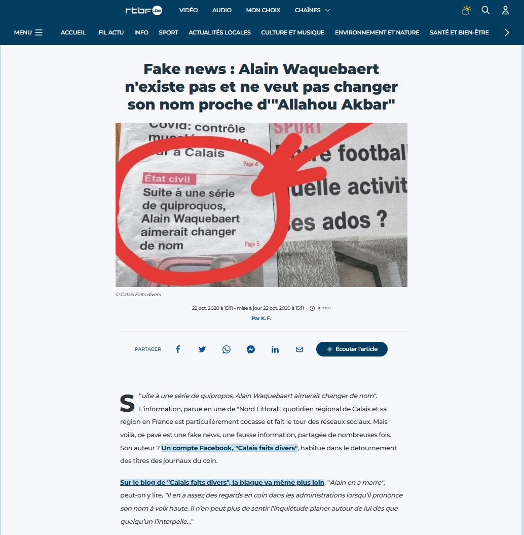 Ca va faire 3 ans que c'est debunké. ^^' ![]() Fake news : Alain Waquebaert n'existe pas et ne veut pas changer son nom proche d'"Allahou Akbar"