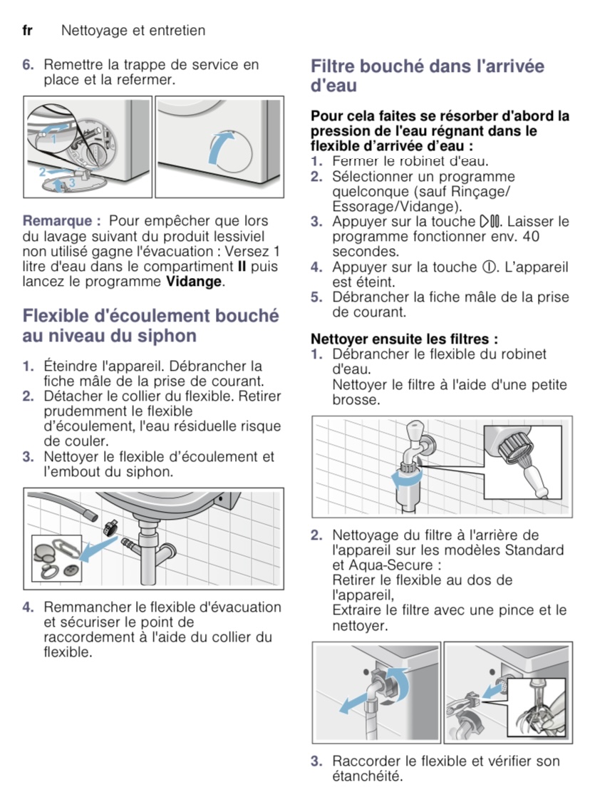 En fait je pense que tu n'as pas compris mon problème ![]() C'est pas une histoire de "bip" (j'ai désactivé le bip de fin d'ailleurs), c'est un problème d'alerte : robinet. Le problème : soit y a un problème d'arrivée d'eau, soit du calcaire qui bouche, soit la sortie d'eau qui bouche. J'ai tout démonté et vérifié : arrivée d'eau, débit à la base, élimination du calcaire qui bouchait les petites sorties au niveau du bac lessive, j'ai vidangé, etc. La machine tourne correctement, l'eau s'écoule bien mais j'ai toujours l'alerte. Impossible de savoir si c'est parce que la panne est restée dans la mémoire de l'électronique ou s'il y a un problème ailleurs que je ne peux pas voir. J'aurais aimé éviter devoir appeler un dépanneur (surtout au mois de décembre avec tout ce qu'il y a payer en fin d'année), mais je commence à me dire que je ne vais pas avoir le choix.