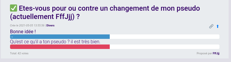 Il y a donc une majorité qui veut que je change de pseudo : ![]() 50% c'est pas la majorité diront certains, et bien ils ont tort de ce fier aux images car moi aussi je veux changer de pseudo et je ne me souviens plus ce que j'ai voté (pour voir les résultats). Voila donc, révélé, à vos yeux ébahis, mon nouveau pseudo : FefefeuJejejeu ![]()