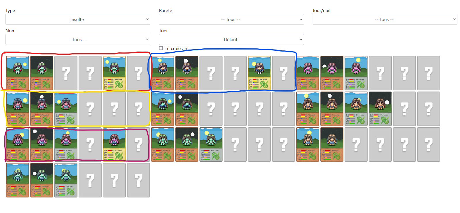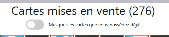 Des précisions: - L'info au survol est présente aussi sur les smartphones. - Si tu mets le numéro de la carte dans la barre de recherche de l'hôtel de vente, ça t'affiche la page de magasin de la carte. Tu n'es pas obligée de faire ça manuellement dans le lien. - Sur la page "Vos cartes", tu peux jouer avec 2 systèmes: TRIER et FILTRER. Ça te permet de savoir rapidement ce qu'il te manque ou nom. - Chaque carte peut être obtenue en 6 variations: jour/nuit && bronze/argent/or (2x3=6). - Pour le but: c'est un jeu de carte de collection. Je vais pas te cacher qu'obtenir toutes les cartes peut être très long. A toi de décider ce que tu veux collectionner. Moi j'ai décidé d'obtenir toutes les cartes de type Insulte (dans un premier temps). Pour cela, je n'achète des boosters QUE lorsque le booster de la semaine est de type INSULTE. Je revends la plupart de mes autres cartes. J'essaie d'acheter dans l'Hôtel de vente les INSULTES qui me manque. Et j'améliore mes cartes pour les avoir d'un niveau de rareté supérieur. Pour savoir où j'en suis, je vais sur ma page de cartes et je filtre par type. Les cartes sont automatiquement groupées par 6. Donc tu peux en déduire ce qu'il te manque. Ci-dessous un exemple, filtré par INSULTE. ![]() Et l'ordre d'affichage est celui-ci: • Une carte ** Bronze --- Jour --- Nuit ** Argent --- Jour --- Nuit ** Or --- Jour --- Nuit • Une autre carte ...etc T'en déduis assez rapidement que j'ai toutes les bronzes, qu'il me manque 4 Argent de jour, 10 de nuit, 7 Or de jour et toutes les Or nuit. @Le_Relou Citation : @Wiliwilliam s'il te plait, ça serait bien d'avoir un lien direct avec l'Hôtel de vente directement sur les cartes manquantes de son propre deck (enfin si c'est possible à coder, d'avance merci ) Tu voudrais un lien, lorsque l'on clique dessus, ça t'affiche une page comme celle-ci: https://appli.koreus.com/user/games/hdv.php?search&envente mais avec la liste des cartes en ventes que tu ne possèdes pas?
