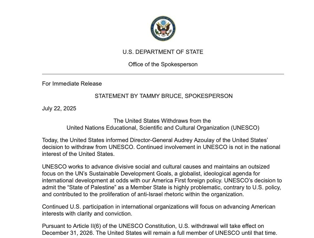![]() L'UNESCO, c'est quoi? Citation : C'est une organisation se propose de contribuer au maintien de la paix et de la sécurité en resserrant, par l’éducation, la science et la culture, la collaboration entre nations, afin d’assurer le respect universel de la justice, de la loi, des droits de l’homme et des libertés fondamentales pour tous, sans distinction de race, de sexe, de langue ou de religion, que la Charte des Nations Unies reconnaît à tous les peuples. La porte-parole du département d'Etat (US) dénonce notamment "une feuille de route idéologique et mondialiste", incompatible avec le principe America-first. Comprenez: "l'UNESCO est anti-sémite."