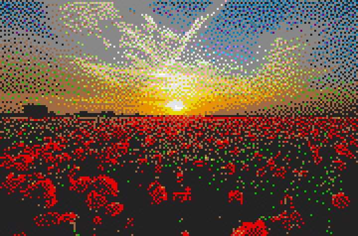 Si je comprends bien ta question: Pour ma part, j'utilise Photoshop. Je commence par importer mon image et je l'adapte au bon format (1 pixel de l’image = 1 pixel sur le canvas). Ensuite, je change le mode de l'image en couleurs indexées et j'applique une palette contenant uniquement les couleurs disponibles dans PixelK. Le logiciel remplace alors automatiquement chaque teinte de l'image par la couleur la plus proche dans la palette. Pour obtenir un meilleur rendu, il faut aussi jouer avec l'option de tramage. Elle permet de simuler de nouvelles nuances en combinant plusieurs couleurs rapprochées. Par exemple, sur l'avatar de Koreus, les dégradés d'orange de la carotte sont recréés grâce à un mélange de pixels rouges, marron et noirs dont la densité varie. exemple concret: J'ai pris cette image sur le web https://emotions-numeriques.com/wp-content/uploads/2021/07/coucher-soleil-coquelicots.jpg je l'ai redimensionnée dans une taille adapté au canvas. (bon pour qu'on y voit quelquechose sur le forum j'ai fait x4) ![]() sans tramage ![]() avec tramage ![]() C'est pas le meilleur exemple mais tu comprends le principe. Sinon, voici la palette de couleur RVB du jeu: • Blanc: #FFFFFF ■ • Gris clair: #E4E4E4 ■ • Gris: #888888 ■ • Noir: #222222 ■ • Rose: #FFA7D1 ■ • Rouge: #E50000 ■ • Orange: #E59500 ■ • Marron: #A06A42 ■ • Jaune: #E5D900 ■ • Vert clair: #94E044 ■ • Vert: #02BE01 ■ • Cyan: #00D3DD ■ • Bleu: #0083C7 ■ • Bleu foncé: #0000EA ■ • Magenta: #CF6EE4 ■ • Violet: #820080 â– Â