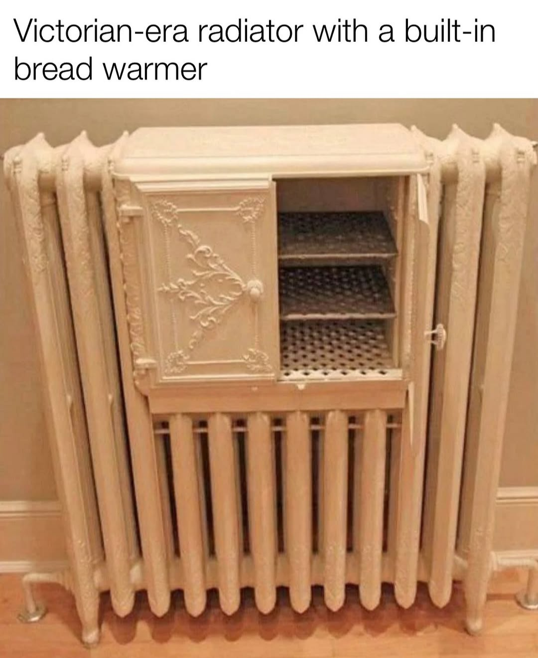 Un radiateur d'époque victorienne avec un chauffe-pain intégré.