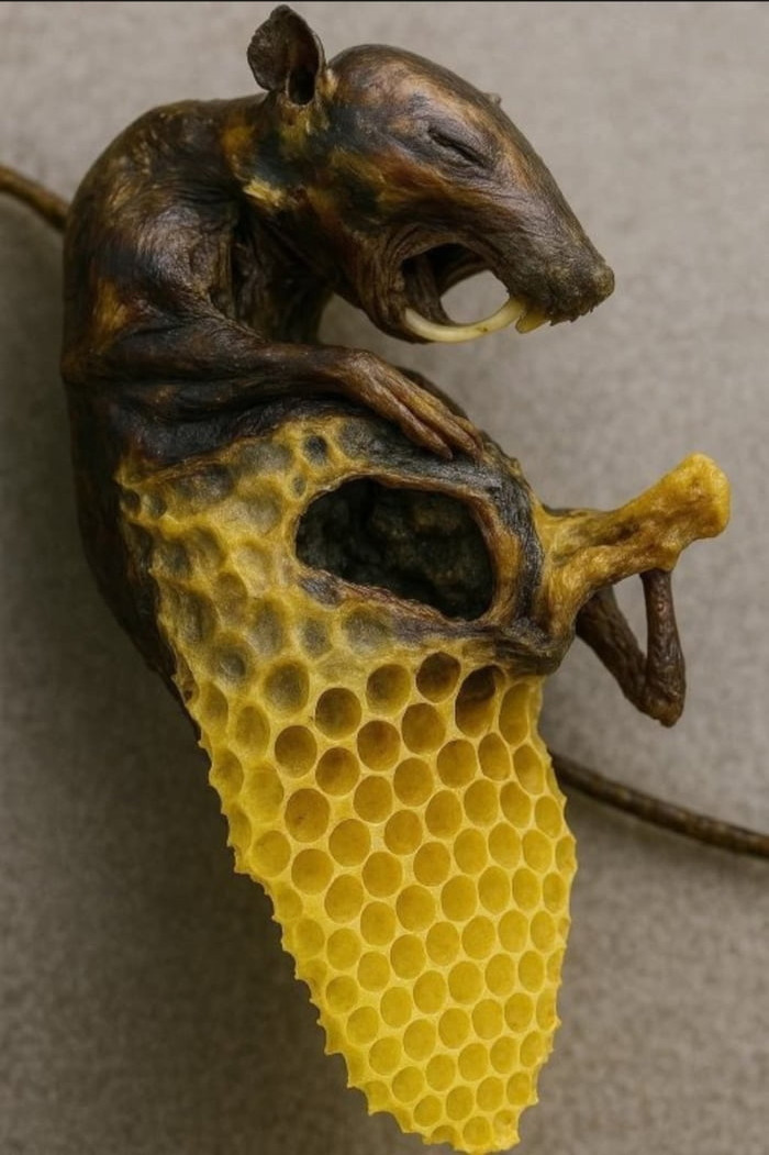 ![]() Paraît que ça arrive... souvent en hiver. La souris est attirée par un endroit chaud (ou tout du moins isolé) et avec une nourriture abondante. Les abeilles hivernent donc elles s'en foutent un peu. Mais quand elles se réveillent, le squatteur se fait dézinguer. Comme il est trop gros/lourd pour être extrait de la ruche, il est désinfecté à grands coups de propolis et fini comme support pour de nouvelles alvéoles.