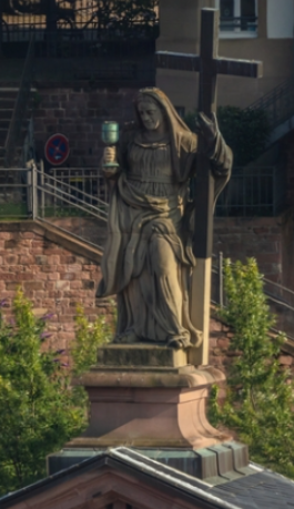 La statue d'une femme avec une croix dans une main et une choppe dans l'autre