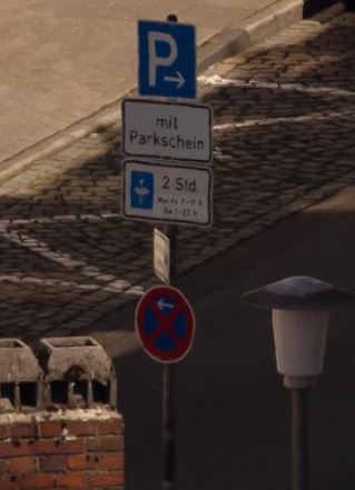- L'hôtel Mercure - Un vase chinois(à priori) - Un homme avec une casquette assis sur une chaise - Deux chaises bleues avec accoudoirs - Un quai de tramway - Une promeneuse avec un haut blanc et un sac à main en bandoulière - Un panneau Tierisch individuel - Une lampe blanche avec une feuille blanche à côté - Une parabole couleur brique foncée - Un panneau de stationnement et arrêt interdis dans les deux sens C'était une belle ville quand j'y étais allé.