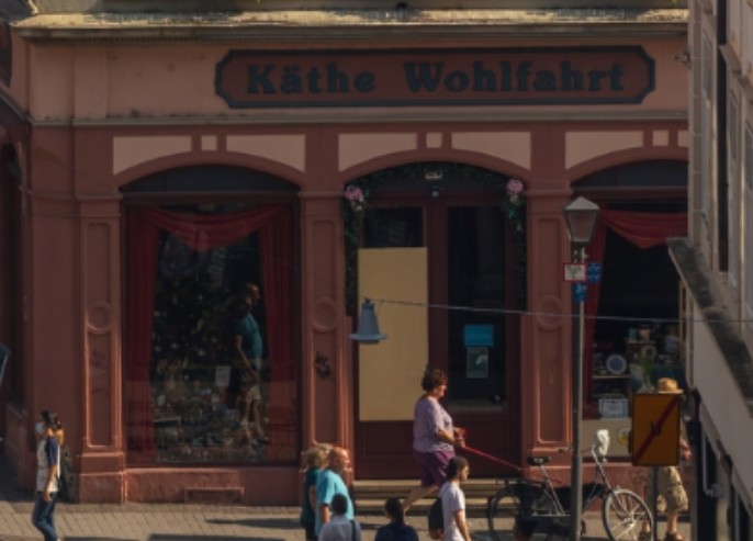 Un parasol Krombacher Une femme avec une robe de soirée rouge (dos nu) Des gradins avec des sièges bleus Une statue d'une femme avec une croix dans une main et une chope dans l'autre L'enseigne du magasin "Käthe Wohlfahrt"