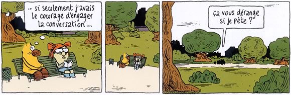Une petite fraise discute dans le jardin avec une petite crotte et lui dit : -C'que t'es moche ; et en plus, qu'est-ce que tu pues ! Le jardinier arrive , ramasse la petite fraise et la met à sa bouche. Alors la petite crotte la regarde et lui dit : -A tout à l'heure ! !