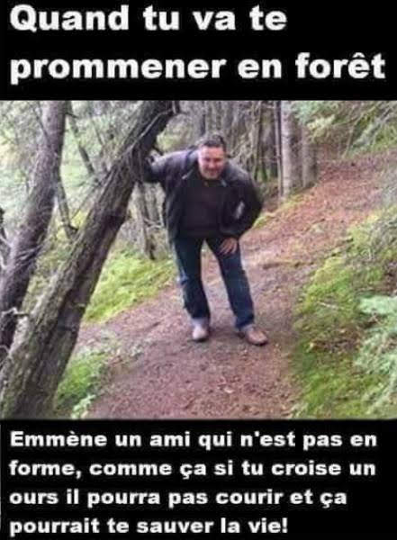| Je poste trop ![]() Inscrit le: 9/12/2005 Envois: 84787 Karma: 9213 |   Re: Un ours surgit d'un buisson à quelques mètres d&...  1  Ne te retourne surtout pas, il y a un énorme ours derrière toi. qu'est ce que tu veux faire à parts te retourner pour voir à ce moment là?   |