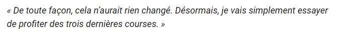 Mais il serait temps qu'il arrête la formule 1, ce mec est un danger pour lui et les autres. Il se croit seul sur la piste, ça passe de gauche à droite sans se soucier des autres voitures...