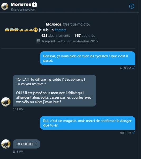 Ensuite le motard tout aussi con agresse et insulte risquant de blessé le cycliste pour si peut , connard aussi.