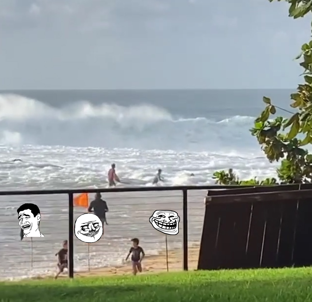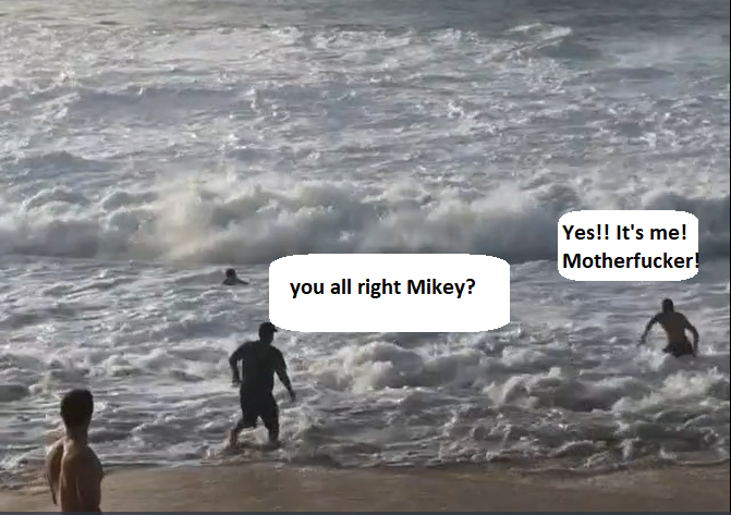 "buvait une bière en bord de mère" je ne sais pas si ce lapsus est fait exprès mais il est excellent !! Sinon les vagues sont impressionnantes (comment la fille en bikini rouge ce fait jeter !!)
