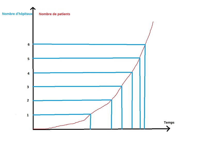 Si on représente le nombre de patients en fonction du temps, et que l'on marque la capacité d’accueil en fonction du nombre d’hôpital, on voit bien que à cause de l'exponentielle, doubler le nombre d’hôpital ne double pas le temps avant que l'on atteigne l'engorgement, et plus on rajoute d’hôpitaux, moins cela devient efficace. Donc à un moment il faut bien des mesures pour réduire le fameux R0, et adoucir cette exponentielle, d'où confinement etc