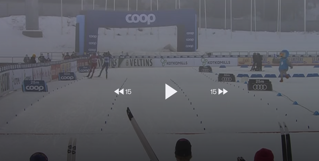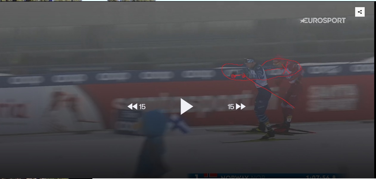 @Tchil T'as l'oeil. j'avais rien vu, Je suis retourné revoir la vidéo et on voit bien les mouvements synchronisés des bras du finlandais qui pousse sur ses batons. Et un peu après 1:06 sur la vidéo, on le voit qui garde le bras droit en l'air puis pendant qu'il pousse sur le baton gauche, il balance son baton droit à l'horizontale en arrière en direction du russe.