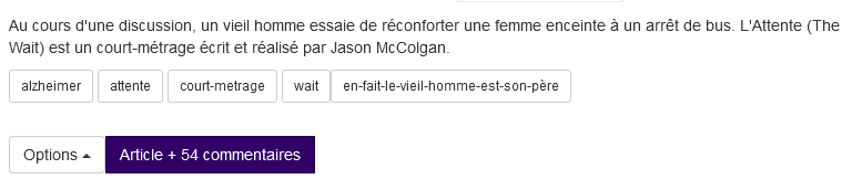 J'ai bien aimé le court métrage pour ma part, surtout le regard de panique de l'acteur qui joue le père à la fin. Parce que c'est peut être ça le pire quand on est avec un proche frappé de démence, les petits éclairs de lucidité où la personne se rends compte qu'elle est en train de dérailler. C'est toujours des moments de souffrance intense.