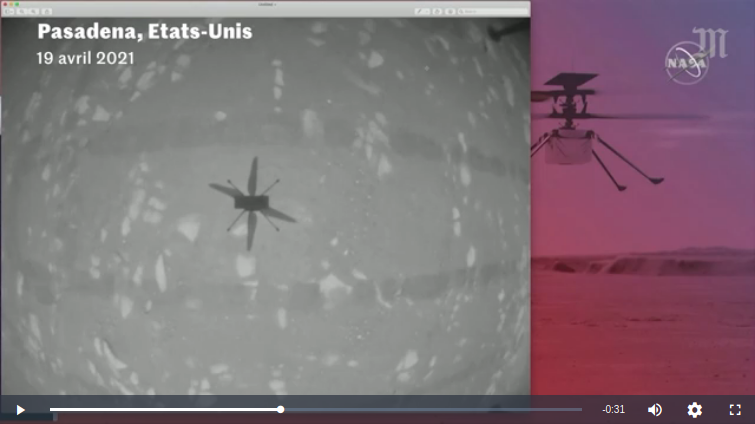 La difficulté n'est pas uniquement de filmer, mais aussi d'envoyer toutes ces données depuis Mars sur la Terre avec des appareils qui ne se rechargent qu'avec leurs panneaux solaires . Petit à petit on aura des versions de meilleurs qualités. La suivante est déjà moins frustrante (on le voit monter, tourner et descendre) :