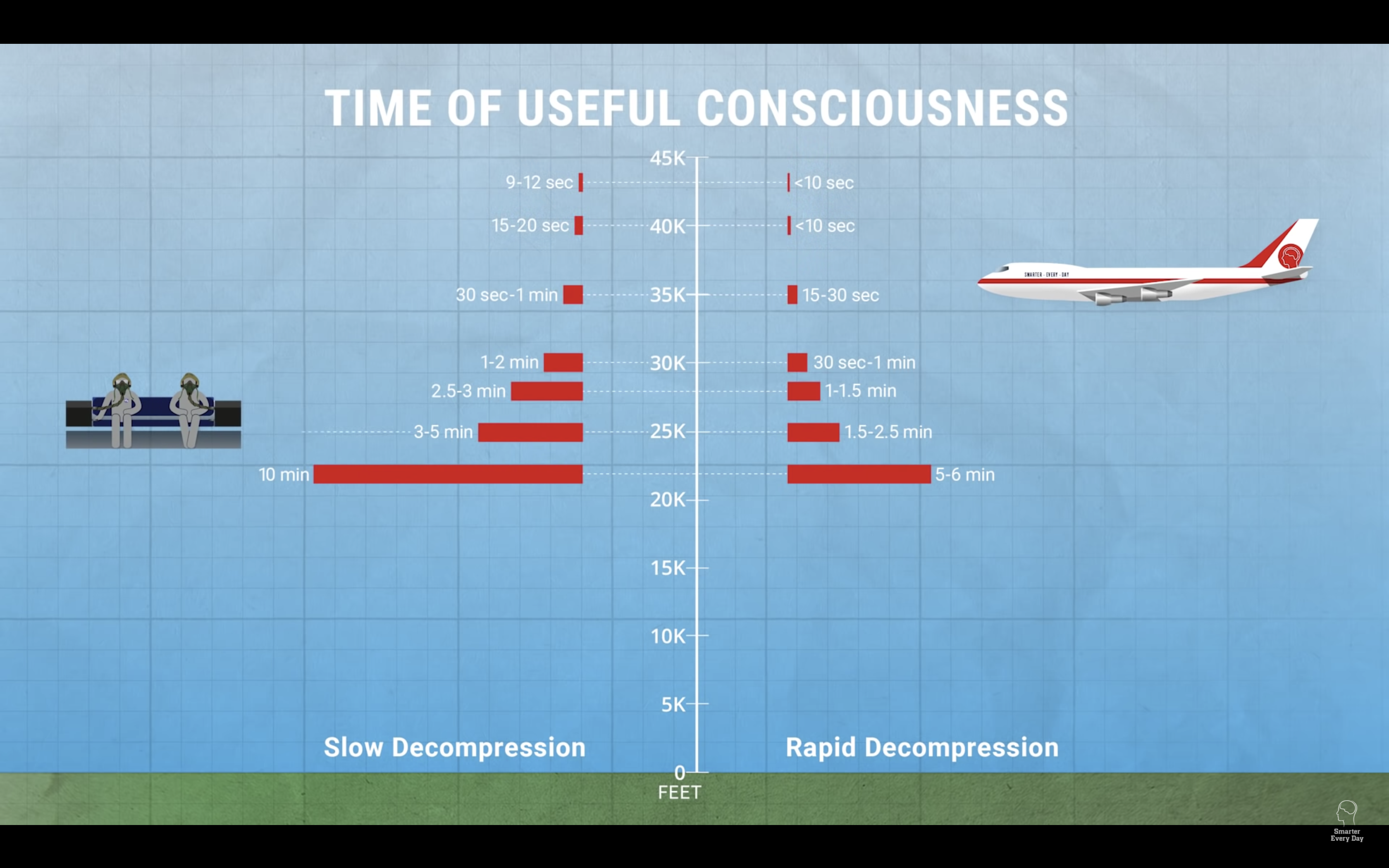 C'est pour ça qu'en avion lors des consignes de sécurités on dit de toujours mettre son masque en premier avant d'aider les autres, car dans l'air sans oxygène à haute altitude, si tu respires normalement tu vas commencer à perdre les pédales au bout de 20-30 secondes puis tomber dans les pommes en moins d'une minute !!! A noter qu'effectivement dans cette situation il vaut mieux retenir sa respiration jusqu'à mettre son masque