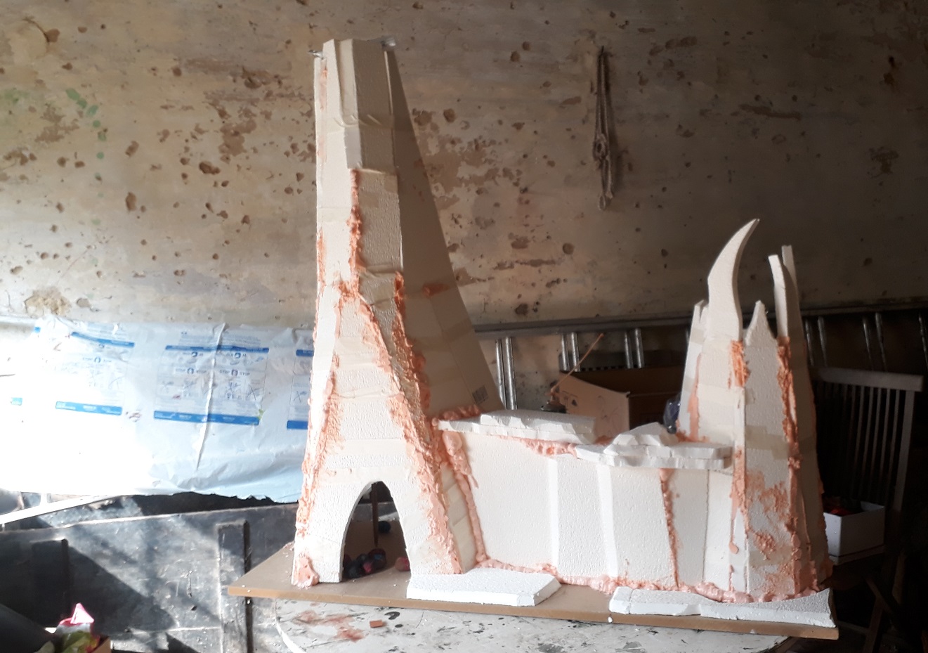 Du coup parce que mes enfants souhaitaient connaître les dessins animés de mon époque ont trouvé Musclor amusant, je me suis mis à construire une « Montagne du Serpent » avec eux. Du coup assemblage de morceau polystyrène (que de la récupe) puis on passera au plâtre et enfin la peinture.